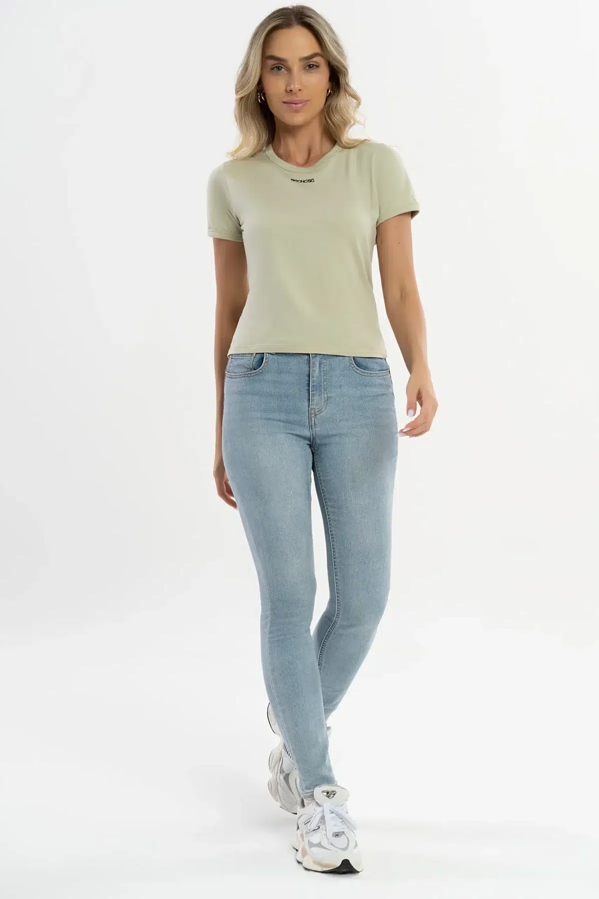 Seu design minimalista, com gola careca e modelagem reta, é realçado por um delicado detalhe em couro sintético termocolante. A cor Moss Gray entrega uma tonalidade neutra e contemporânea, perfeita para combinações elegantes ou casuais.