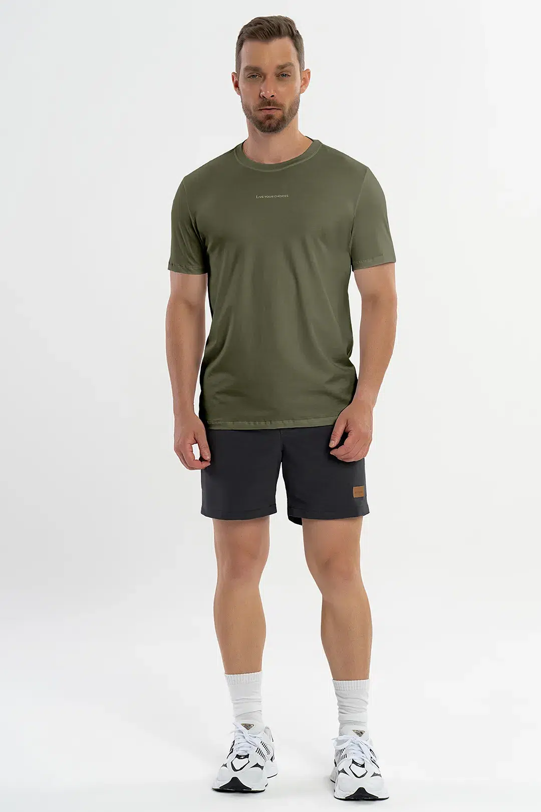Camiseta masculina em algodão Pima, cor Verde Croco, com detalhe em silicone. Conforto e estilo para todas as ocasiões. 🐝