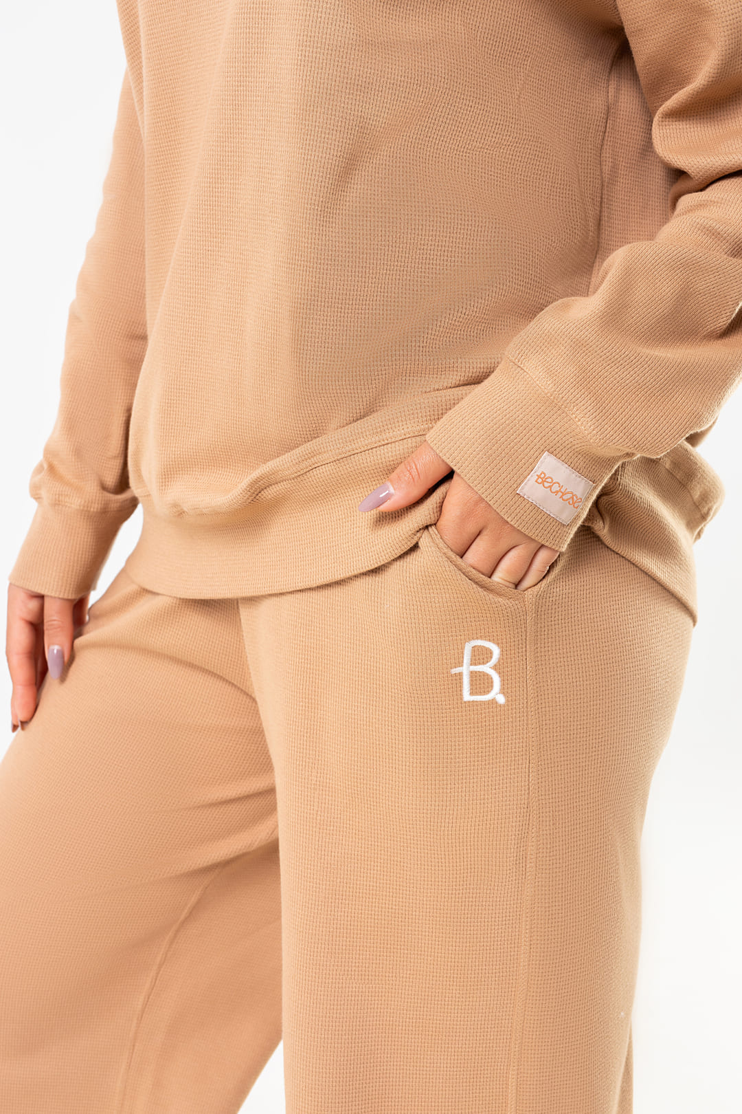 O blusão, com modelagem oversized, traz uma silhueta moderna e descomplicada, destacando o bordado frontal “Bechose”, que imprime identidade com sofisticação. A calça, de corte amplo e fluido, reforça a proposta de liberdade e aconchego, com o bordado “B” sutilmente posicionado próximo ao bolso.