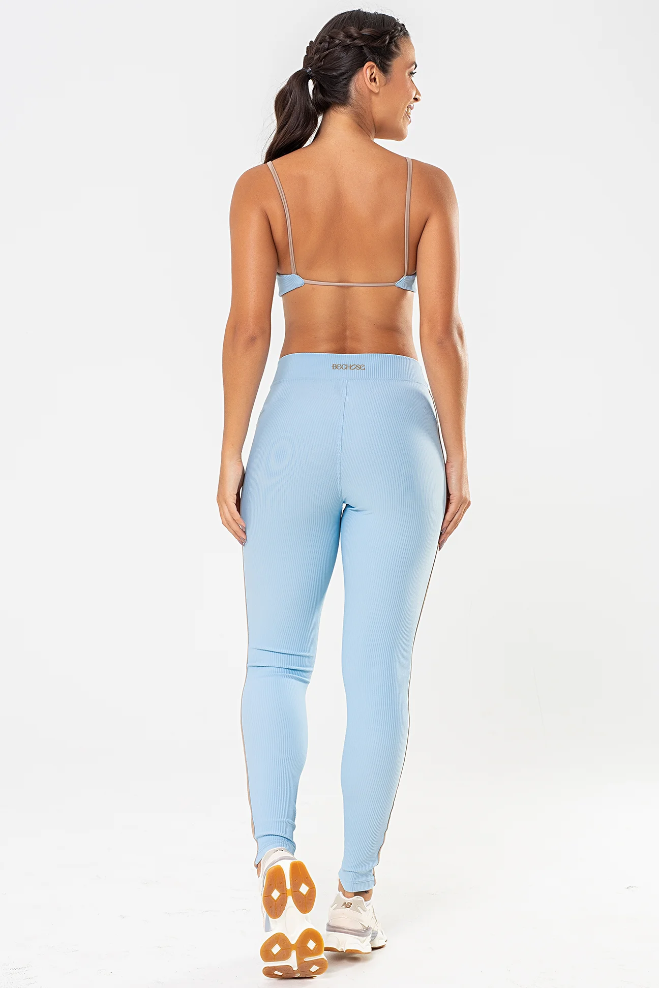 O detalhe lateral em tom castanho cria um contraste elegante com o Azul Ice e ajuda a alongar visualmente a silhueta, trazendo sofisticação ao visual fitness. Ideal para treinos de força, corrida, cross, academia ou para compor looks athleisure com estilo.