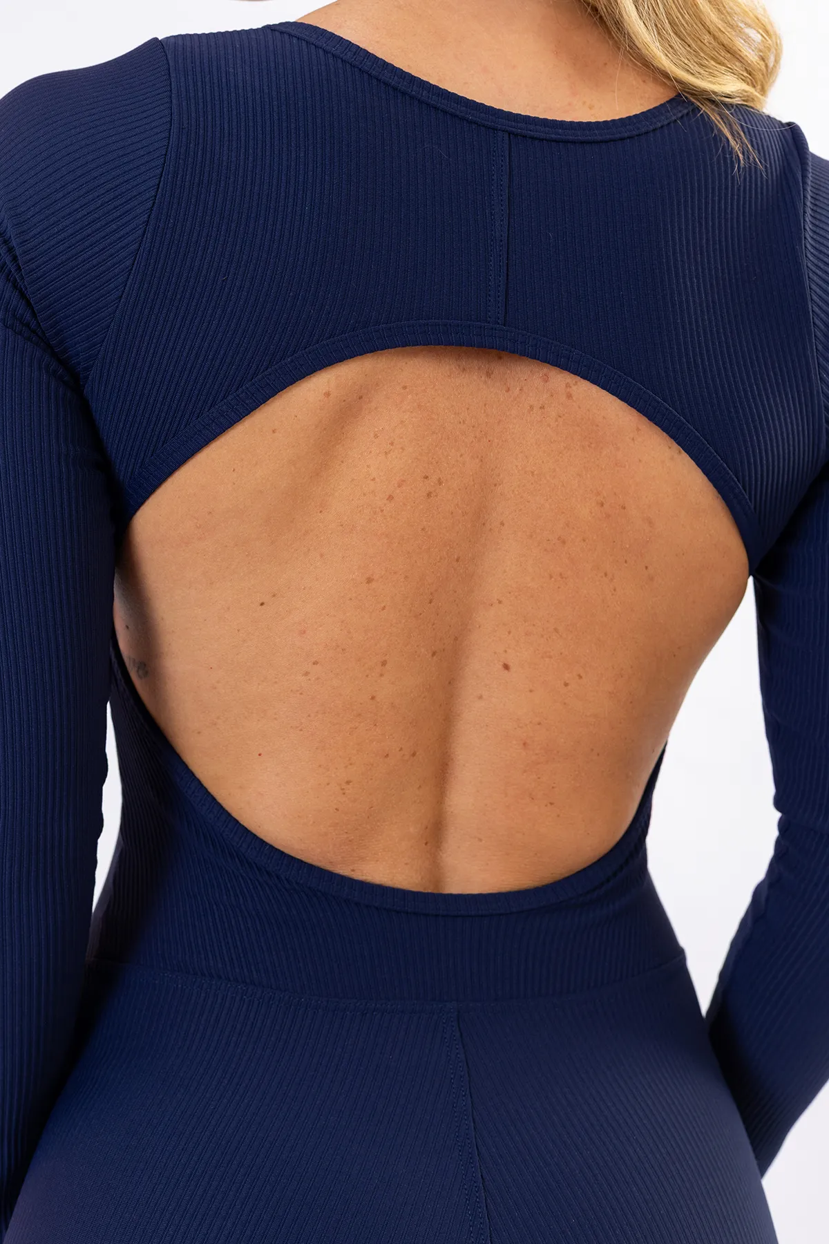 Sua modelagem ajustada ao corpo com comprimento curto proporciona liberdade total de movimento, enquanto as mangas longas equilibram a peça, trazendo proteção e elegância. O destaque fica para o recorte nas costas, que deixa a região à mostra de forma estratégica, adicionando charme sem comprometer a performance.