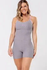 Macaquinho Violeta Cinza Canelado com bojo removível, alças cruzadas reguláveis, recorte frontal e silicone nas pernas para ajuste seguro
