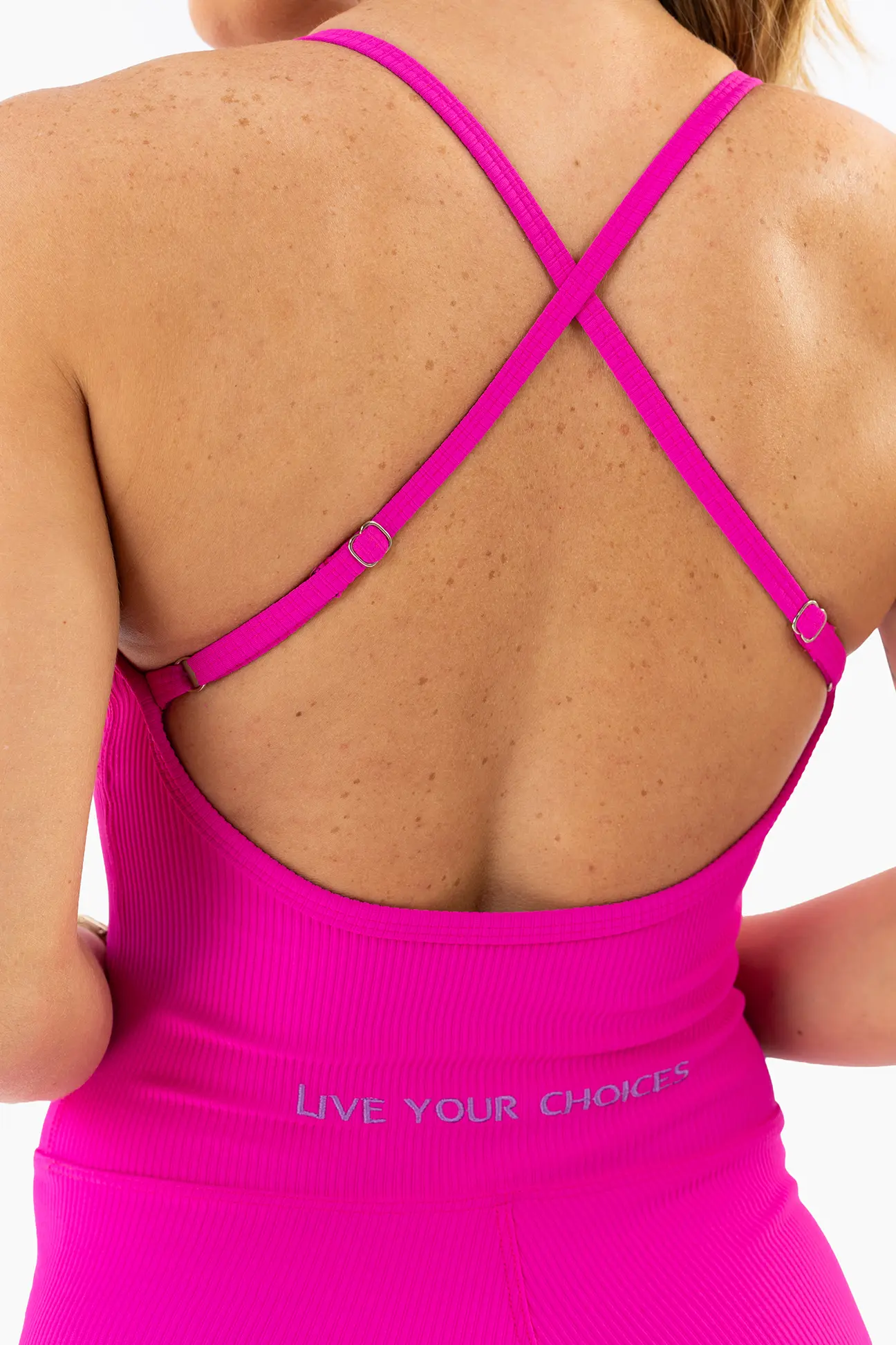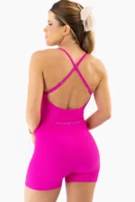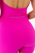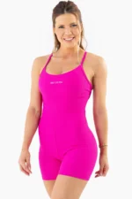 Na cor Rosa Pink Canelado, o Macaquinho Violeta transmite personalidade, estilo e sofisticação, sendo perfeito para composições esportivas ou looks athleisure.