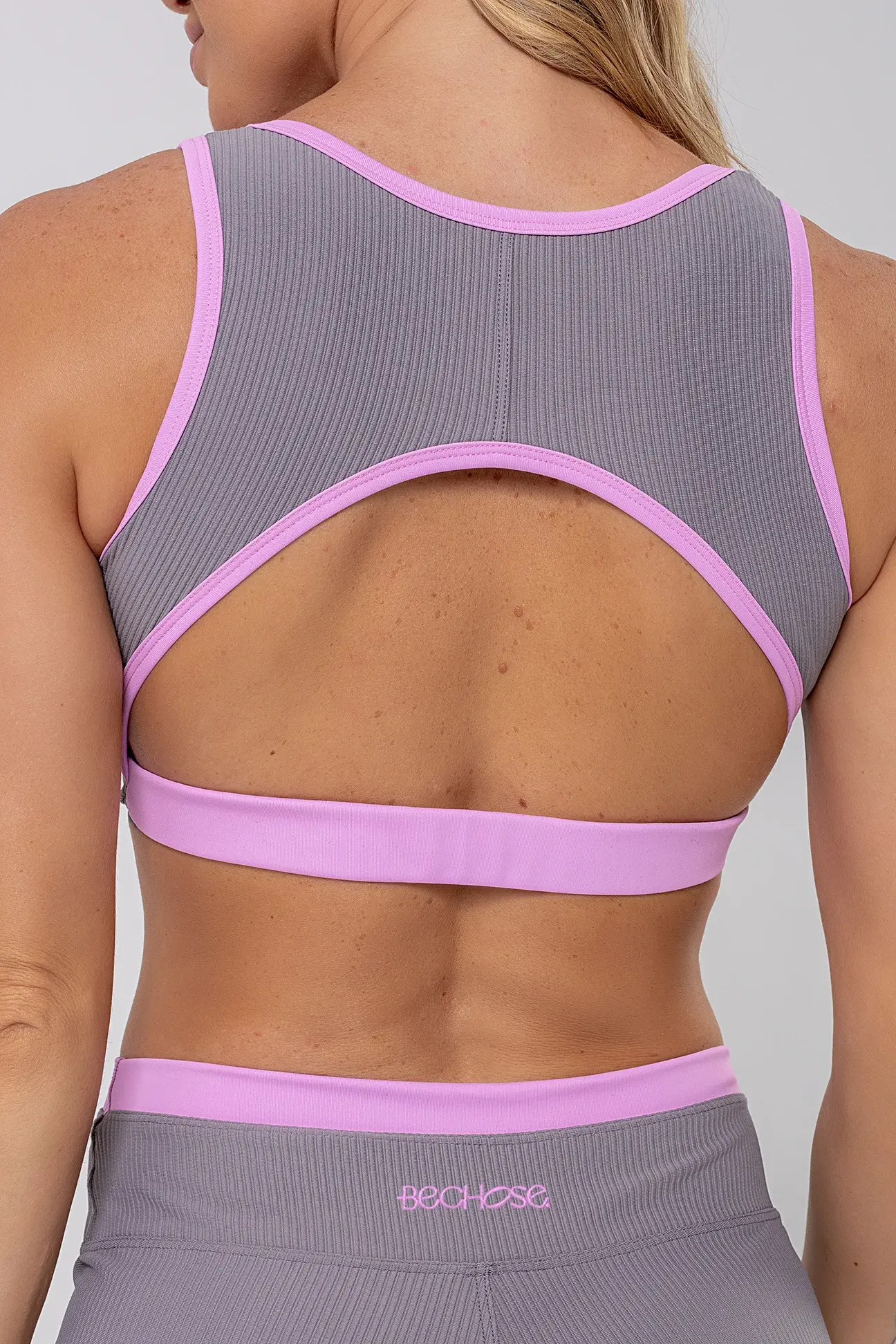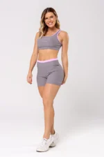 Top Cravo Cinza/Rosa Balerine em Pulse Blackout, com frente dupla, bojo removível, recorte nas costas e cós com elástico interno.