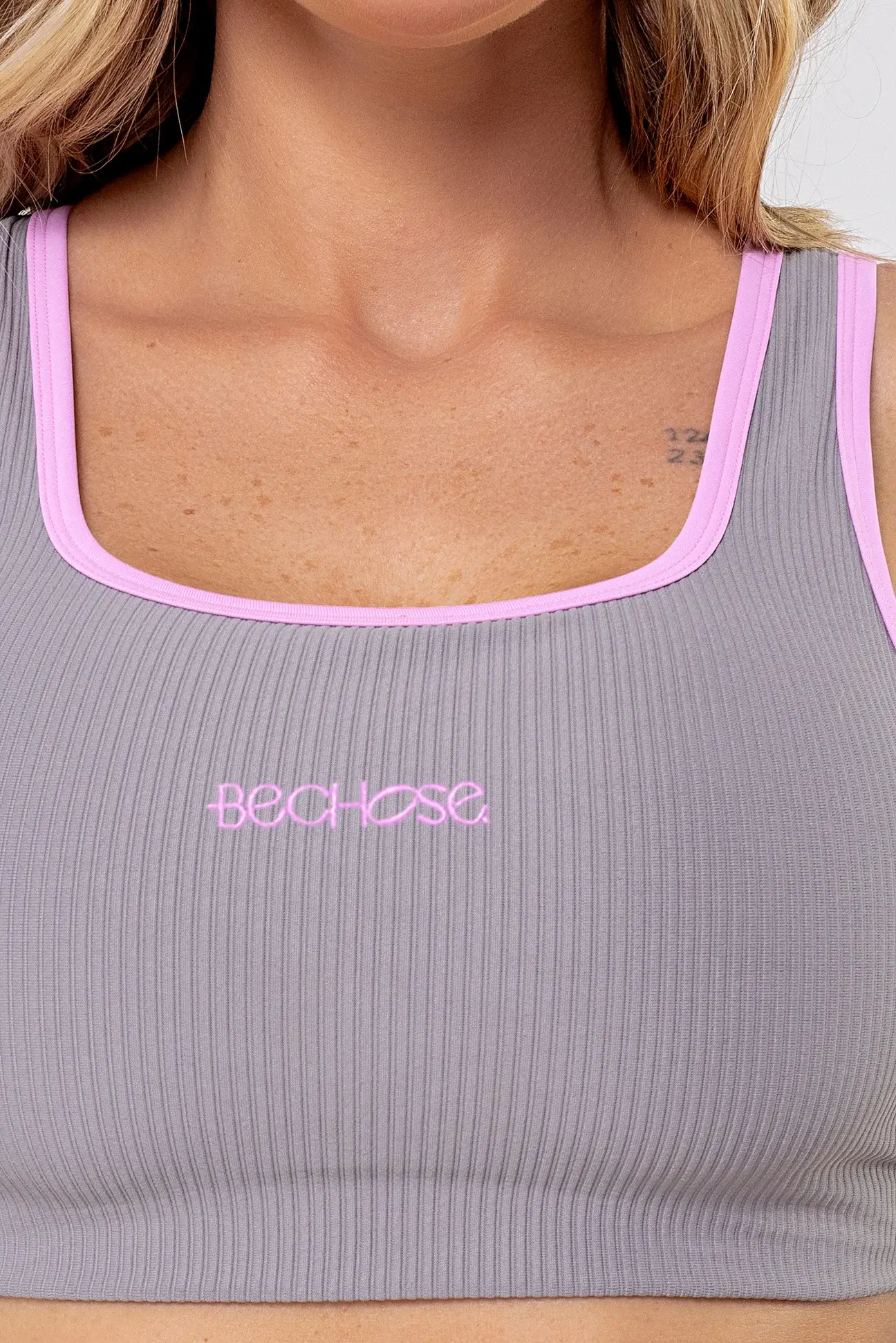 Os detalhes de bordado frontal e estampa interna em DTF reforçam o cuidado nos acabamentos. Na combinação Cinza com Rosa Balerine, o Top Cravo entrega um visual moderno, delicado e fácil de combinar.