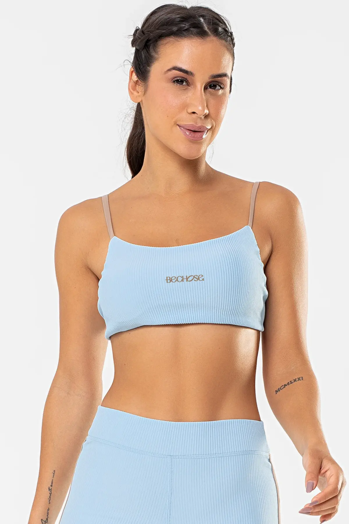 Top fitness canelado com alças finas e elástico interno, oferecendo sustentação confortável, ajuste seguro e design minimalista para treinos e uso diário.